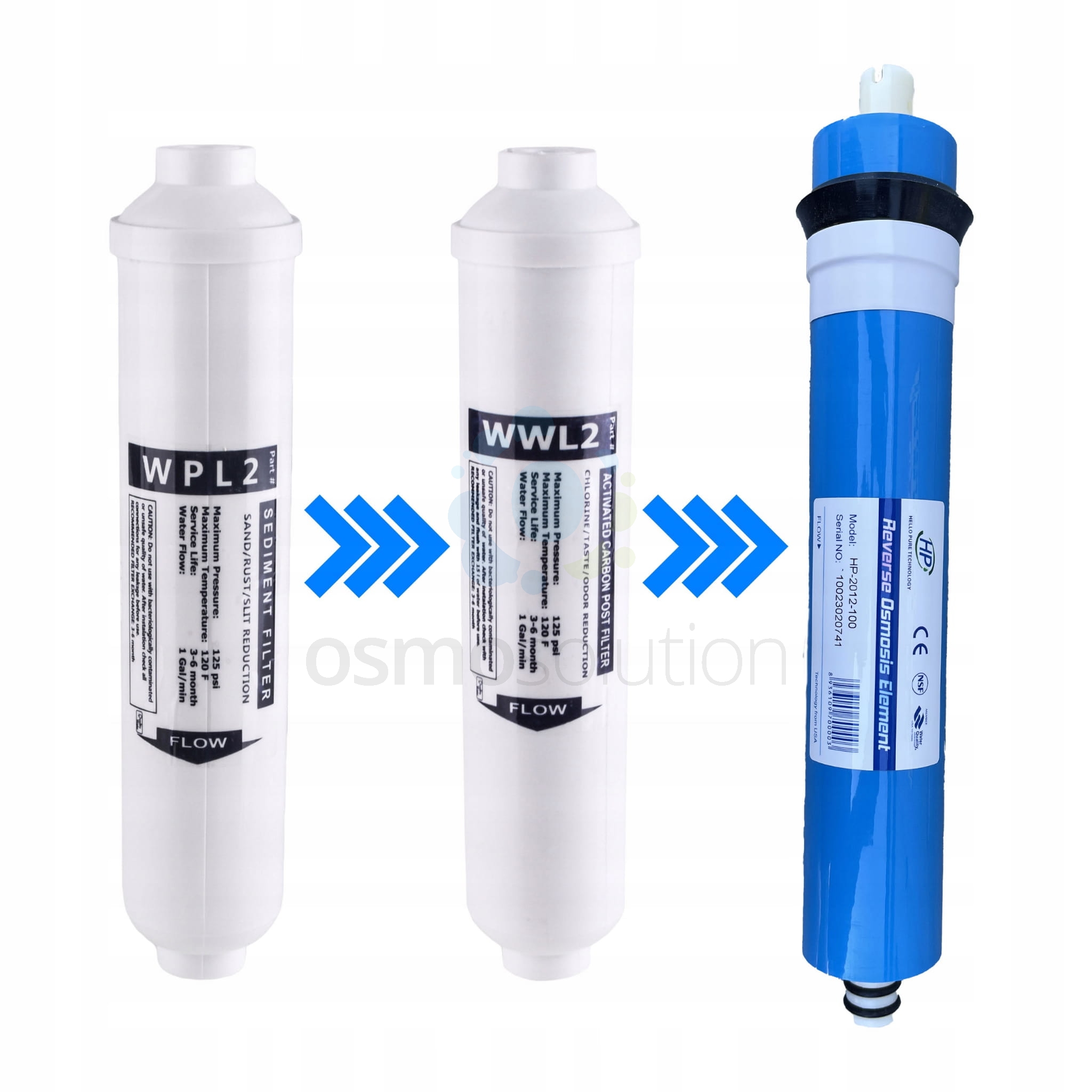 3. HP 100 GPD - membrana osmotyczna marki HELLO PURE. Jest to zespół półprzepuszczalnych błon cienkowarstwowych. Połączona z filtrami z włókniny polipropylenowej oraz węgla aktywowanego, która pozwala uzyskać naprawdę czystą wodę. Membrana osmotyczna usuwa 90-98% wszelkich rozpuszczonych w wodzie związków, jak również bakterie i wirusy. (żywotność membrany szacowana jest na ok. 3 - 5 lat)