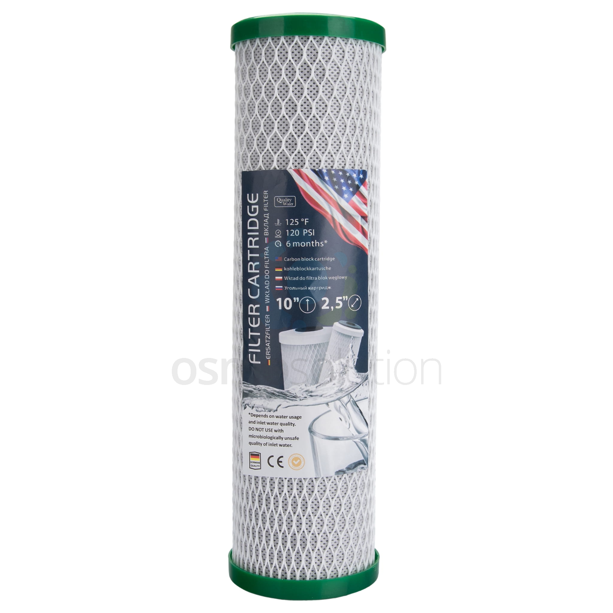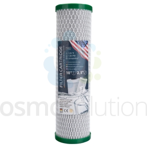 Blok węglowy do systemów uzdatniania wody wykonany został z najwyższej klasy surowców. W jego produkcji jako tworzywo wykorzystano węgiel bitumiczny oraz węgiel z łupin orzechów kokosowych pozbawiony żelaza i metali ciężkich. Produkt spełnia standardy określone przez PZH i NSF. Wykazuje on najwyższą skuteczność w redukowaniu zawartości chloru oraz nieprzyjemnych zapachów wody. Potencjał filtracyjny węgla jest wyjątkowo duży. Tylko 1 gram węgla aktywowanego może posiadać powierzchnie właściwą od ok. 200 do 1500m2. Należy pamiętać aby przed użyciem wkładu dobrze go wypłukać.