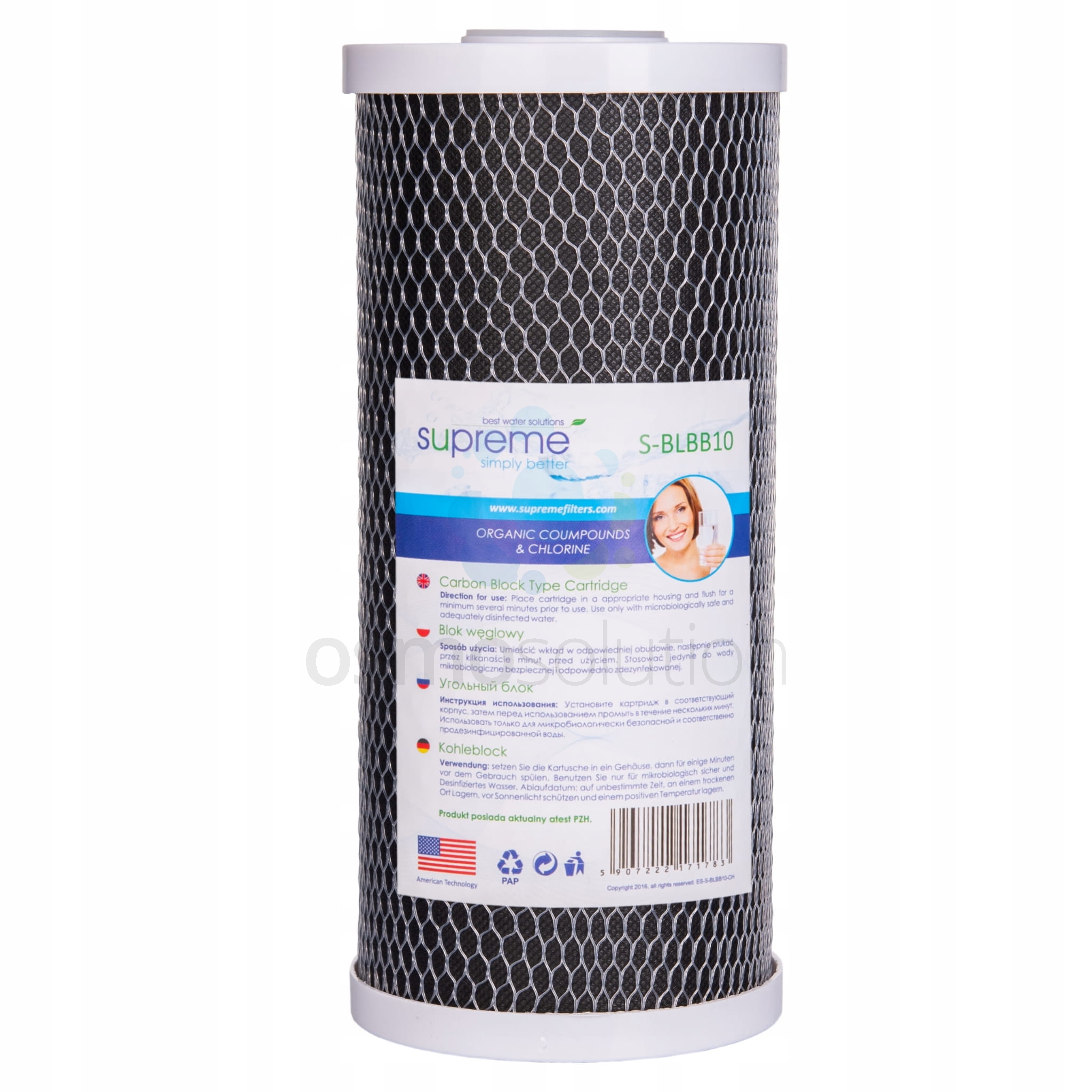 Wkład wykonany ze spiekanego węgla aktywowanego, który usuwa z wody od 98% do 99% wolnego chloru, rozpuszczalników chloropochodnych, węglowodorów aromatycznych (poprawia smak i zapach wody), a także do 85% pestycydów pochodzenia chloropochodnego, związków wieloaromatycznych, fenolu, benzenu oraz substancji organicznych.