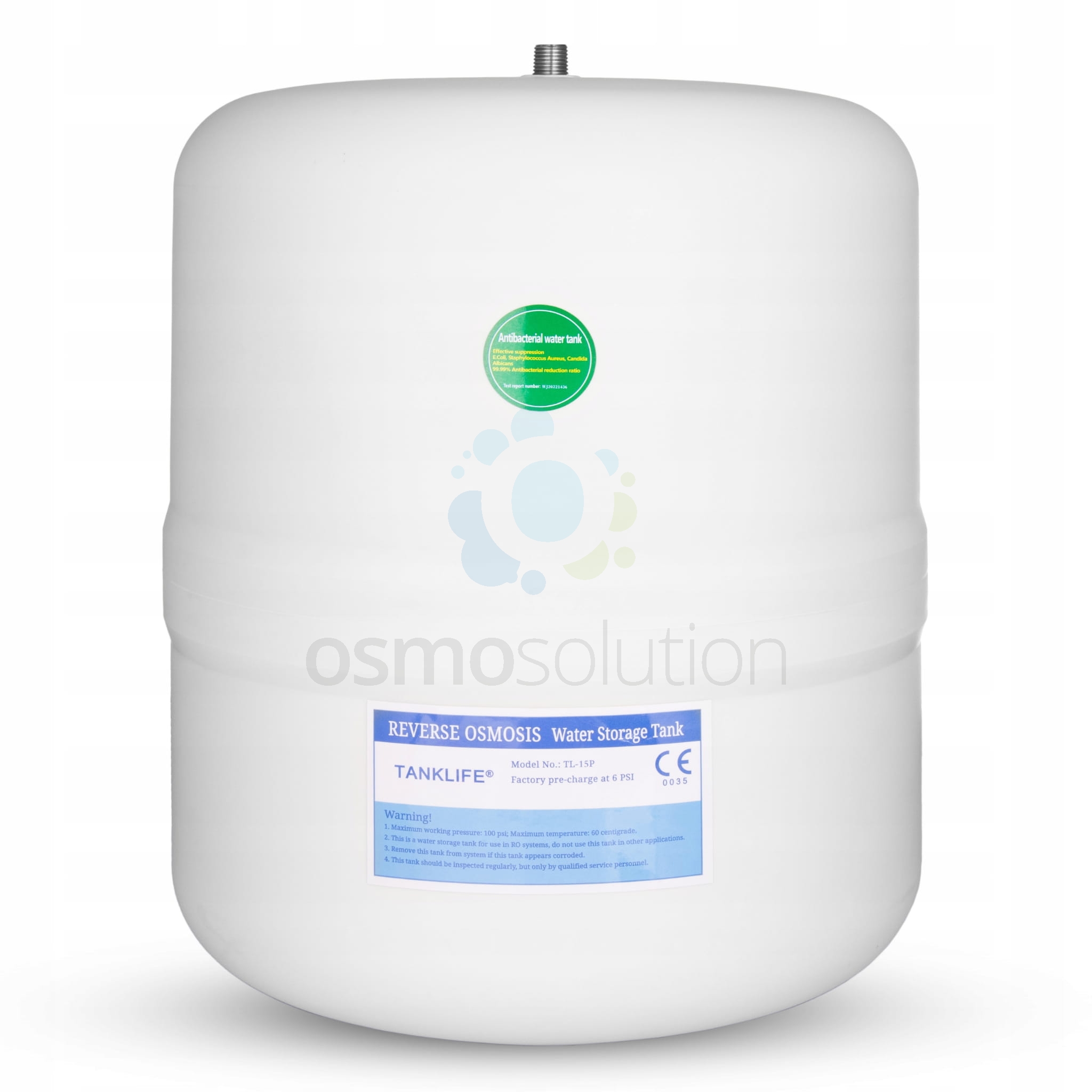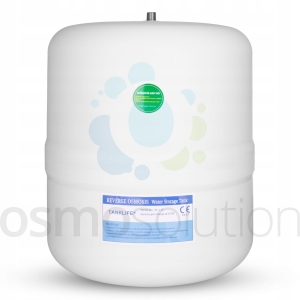Biały, metalowo-plastikowy zbiornik ciśnieniowy do systemów odwróconej osmozy. Przeznaczony jest dla gospodarstw domowych.